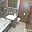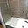 Vkusně obložená vyzděná koupelna se sprchovým koutem se zástěnou a umyvadlem je spojena s toaletou.